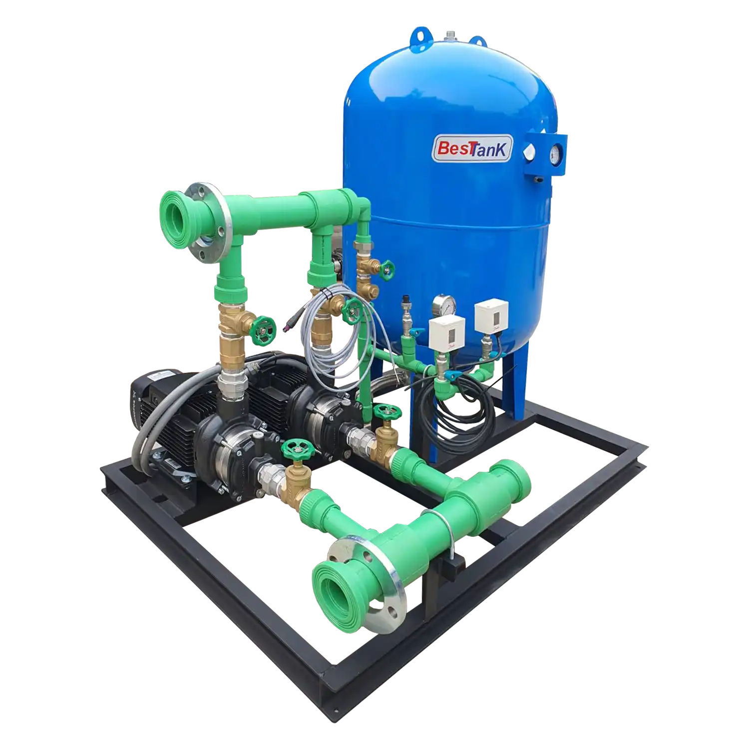 โดยเป็นการนำ เครื่องสูบน้ำรุ่นที่มีประสิทะิภาพสูง มาออกแบบตามกำลังที่ใช้ โดยมีถังรักษาแรงดัน และตู้ควมคุมการทำงานของปั้ม โดยมีเซนเซอร์จับแรงดัน ( pressure swtich oe pressure transmitter )